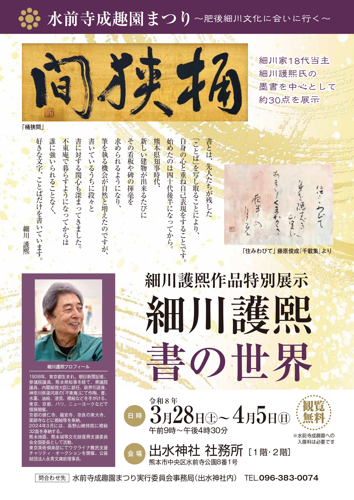 A special exhibition of calligraphy works by Hosokawa Morihiro, the 18th head of the Hosokawa family and former Prime Minister of Japan, will be held in conjunction with the Suizenji Jojuen Garden Festival.
